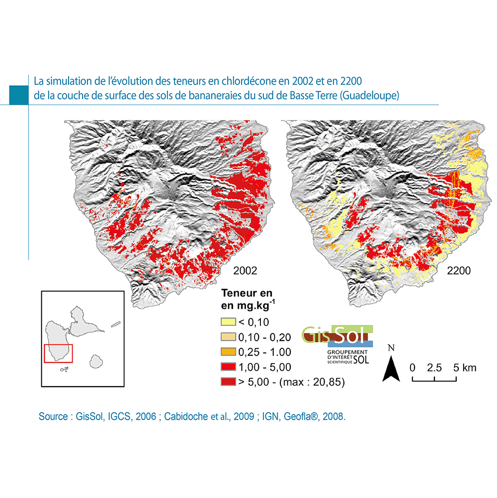 GIS Sol, 2011. La simulation de l’évolution des teneurs en chlordécone en 2002 et en 2200 de la couche de surface des sols de bananeraies du sud de Basse Terre (Guadeloupe). in: L’état des sols de France. Groupement d’intérêt scientifique sur les sols, 188 p.