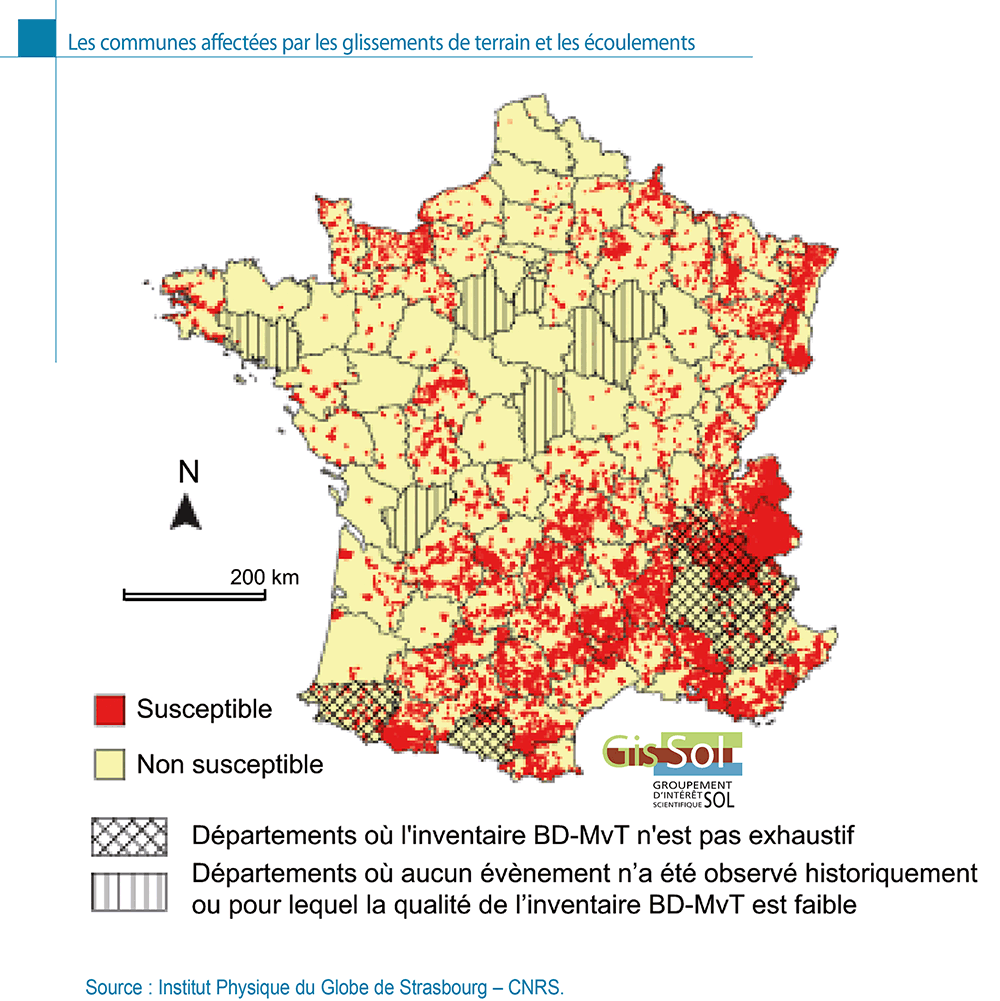 GIS Sol, 2011. Les communes affectées par les glissements de terrain et les écoulements. in: L’état des sols de France. Groupement d’intérêt scientifique sur les sols, 188 p.