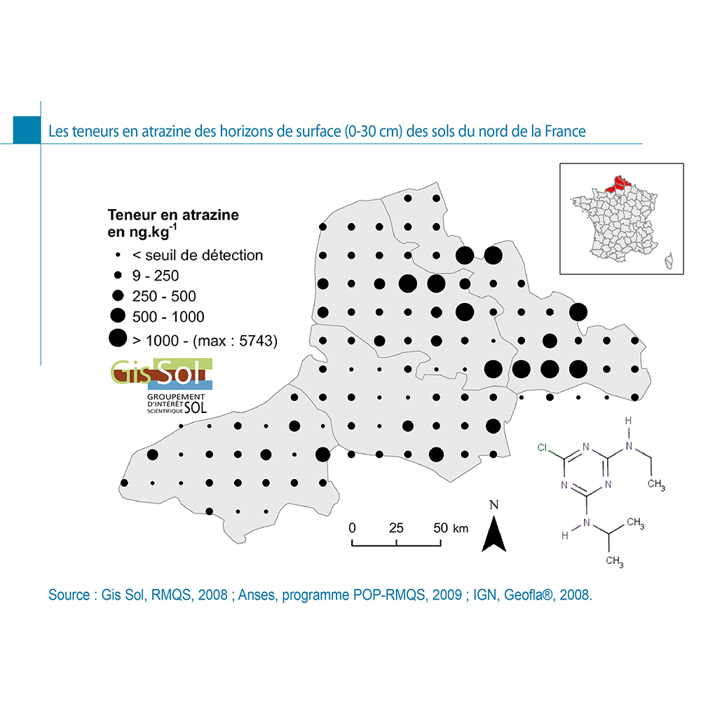 Les teneurs en atrazine dans les sols du nord de la France varient entre quelques ng.kg-1 et des valeurs dépassant 2000 ng.kg-1. Les valeurs les plus élevées se situent en zones agricoles autour du bassin minier. La Somme et la Seine-Maritime semblent moins touchées.