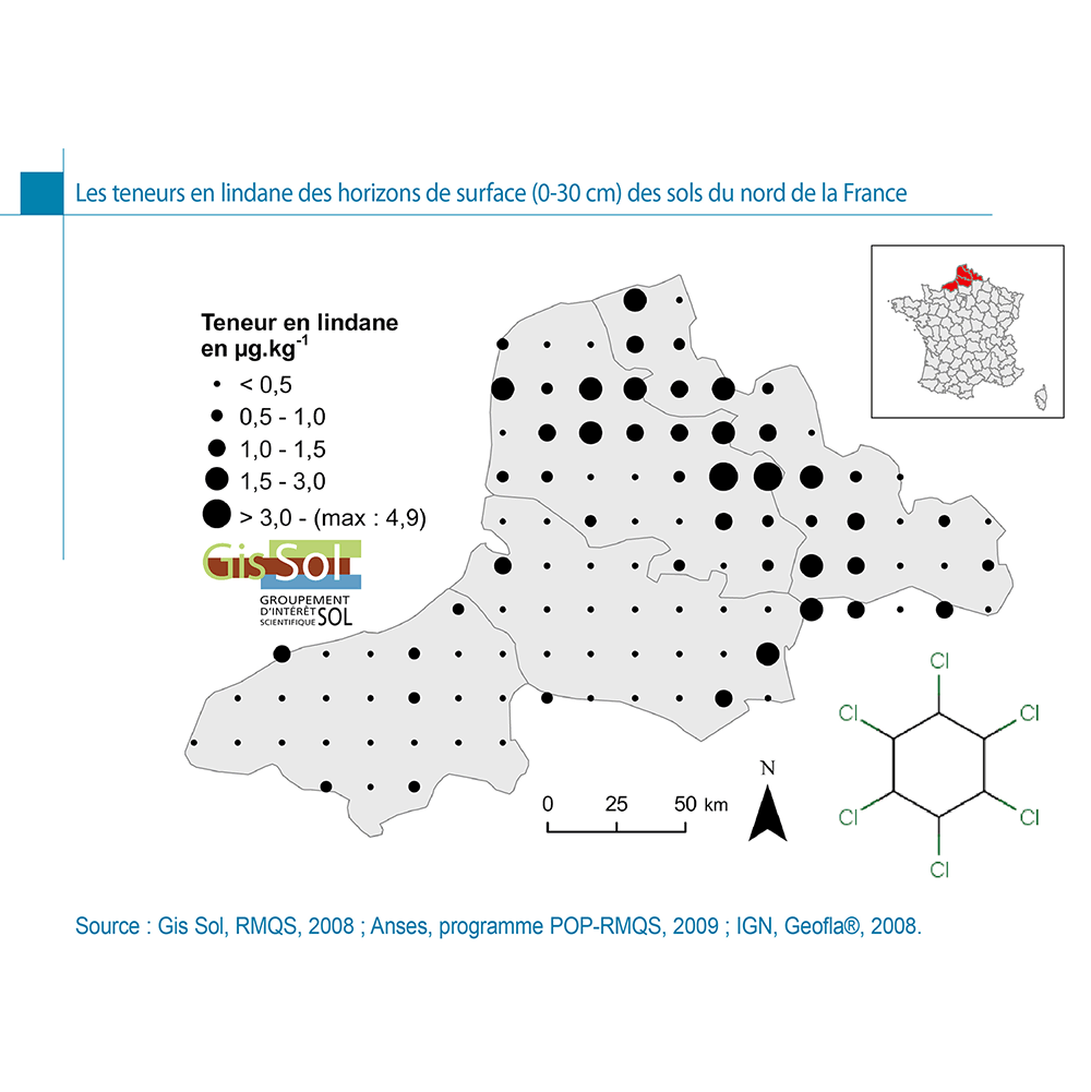 GIS Sol, 2011. Les teneurs en lindane des horizons de surface (0-30 cm) des sols du Nord de la France. In:L’état des sols de France. Groupement d’intérêt scientifique sur les sols, 188 p.