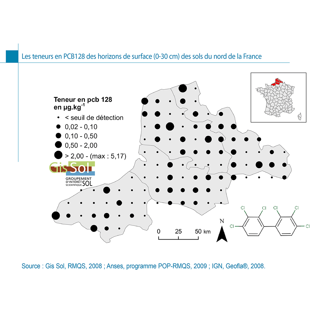 GIS Sol, 2011. Les teneurs en PCB128 des horizons de surface (0-30 cm) des sols du Nord de la France. In:L’état des sols de France. Groupement d’intérêt scientifique sur les sols, 188 p.