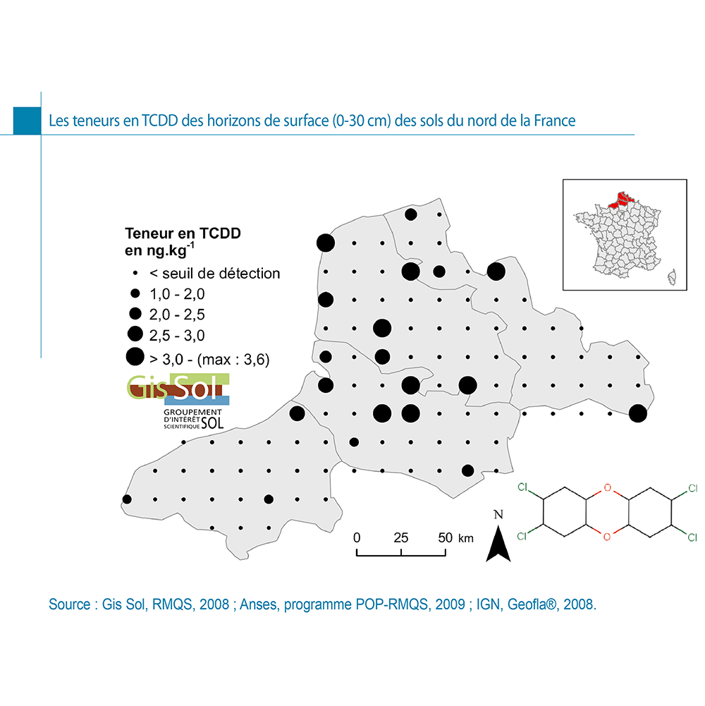 Les teneurs en 2,3,7,8-tétrachlorodibenzo-p-dioxine (TCDD) restent inférieures à 4 ng.kg-1 dans le nord de la France. On observe quelques valeurs élevées autour de certaines villes (Amiens, Arras, Calais, Boulogne-sur-Mer, Dunkerque, Saint-Omer) et autour de l’agglomération Lille-Roubaix-Tourcoing. Il semblerait que la TCDD soit donc principalement concentrée dans les sols en milieu urbain avec une origine probablement à la fois industrielle, routière et domestique.