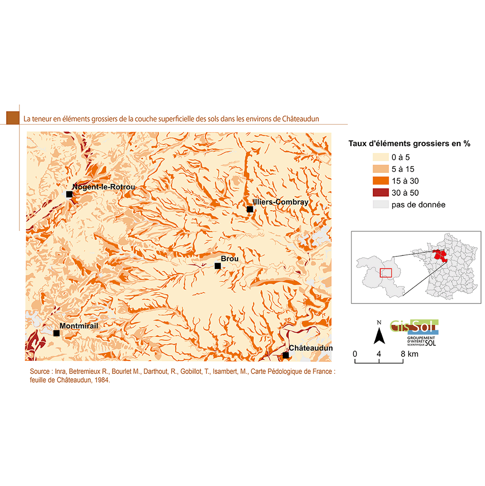 GIS Sol, 2011. La teneur en éléments grossiers de la couche superficielle des sols dans les environs de Châteaudun. in: L’état des sols de France. Groupement d’intérêt scientifique sur les sols, 188 p.