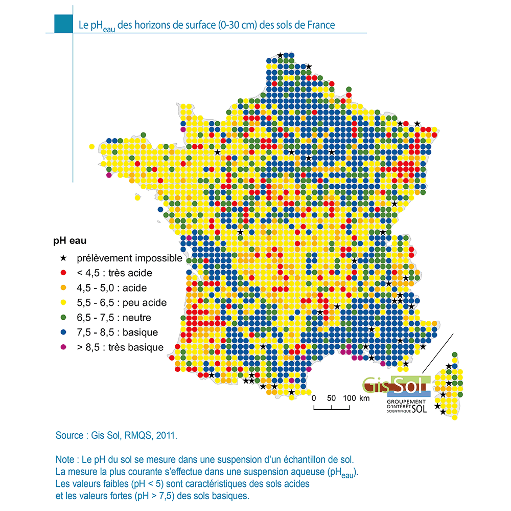 GIS Sol, 2011. Le pHeau des horizons de surface (0-30 cm) des sols de France. in: L’état des sols de France. Groupement d’intérêt scientifique sur les sols, 188 p.