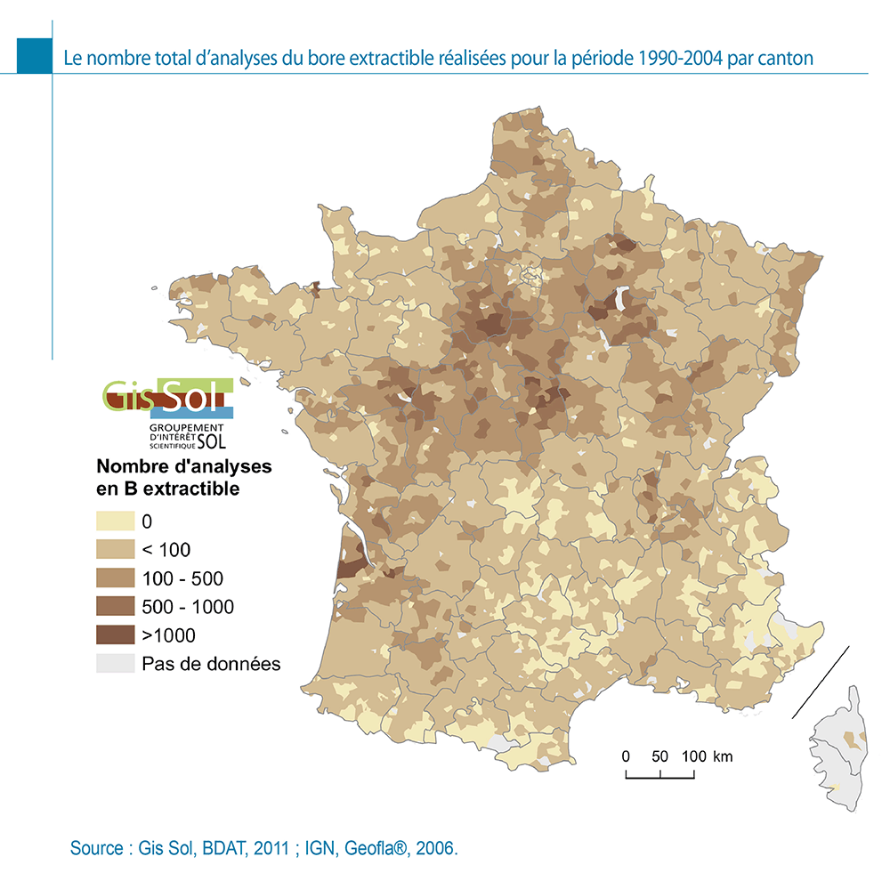 GIS Sol, 2011. Le nombre total d’analyses du bore extractible réalisées pour la période 1990-2004 par canton. in: L’état des sols de France. Groupement d’intérêt scientifique sur les sols, 188 p.
