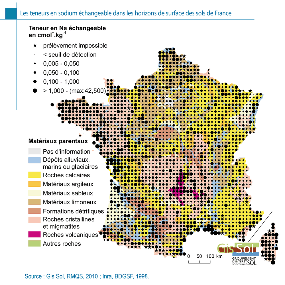 La distribution du sodium échangeable dans les sols de France montre une nette influence maritime. Les sols sous influence directe marine (nappe phréatique salée, sols sous influence des marées) présentent les teneurs les plus fortes. L’influence maritime semble plus modérée en Bretagne, mais s’exprimant sur une distance plus longue le long du littoral. Des teneurs assez élevées sont observées en milieu volcanique. Lorsque les sols ne sont pas à proprement parler salés, mais qu’ils présentent une proportion importante de sodium sur leur complexe adsorbant, ils sont qualifiés de «sodiques». Ils peuvent alors se compacter et limiter l’infiltration de l’eau et de l’air. On peut y remédier par des amendements en gypse.