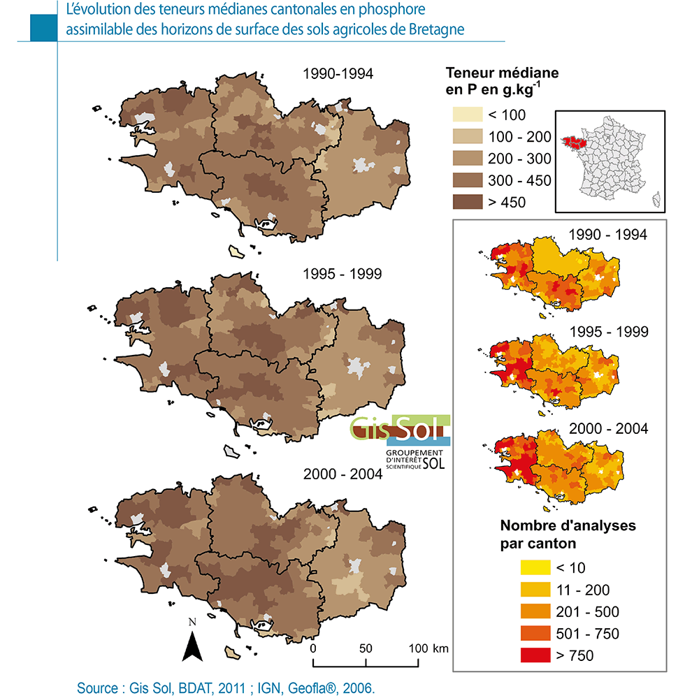 GIS Sol, 2011. L’évolution des teneurs médianes cantonales en phosphore assimilable des horizons de surface des sols agricoles de Bretagne. in: L’état des sols de France. Groupement d’intérêt scientifique sur les sols, 188 p.