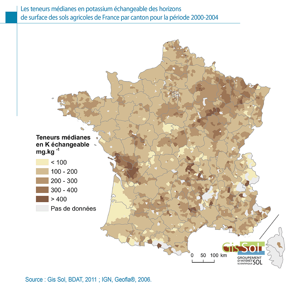 GIS Sol, 2011. Les teneurs médianes en potassium échangeable des horizons de surface des sols agricoles de France par canton pour la période 2000–2004. in: L’état des sols de France. Groupement d’intérêt scientifique sur les sols, 188 p.